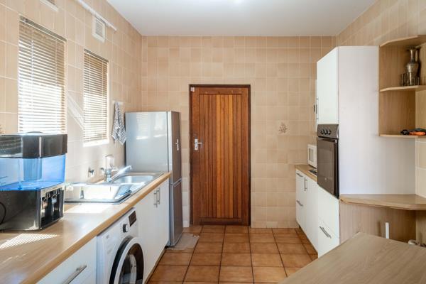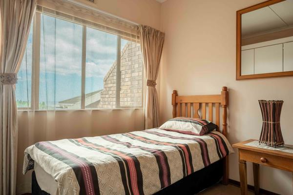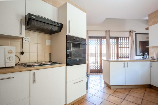 Moving from the kitchen into the dining and cozy living area and outside one discovers an entertainers dream patio, complete with built in braai and two large retractable awnings. A single garage and parking space is available to the resident.