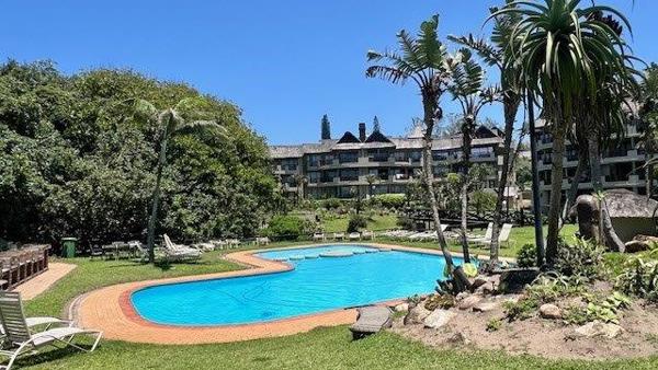 The modern kitchen, with granite counters and a breakfast nook, is great for cooking and entertaining. The complex provides fantastic amenities, including a big communal pool with loungers, a braai area, and direct beach access, all surrounded by lush tropical gardens.