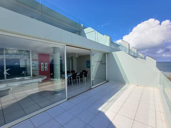 12 Stairs take you up to the front door, where a spacious living area features sliding doors to a covered entertainment patio with gas braai, and an expansive open terrace with breaker sea views.