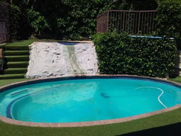 There is loads of parking space, a workshop in progress with a room and bathroom. There is a lovely covered entertainment area perfect for meetings with a childrens pool which cascades into the main pool, and a built in braai area as well makes this perfect space for entertaining.