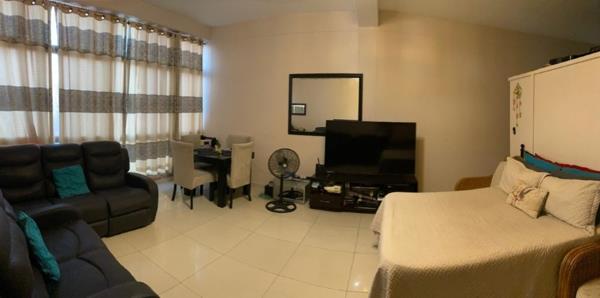 This 64sqm first-floor bachelor flat has been neatly converted into a one-bedroom unit with removable dry walls and cupboards. The open-plan lounge/dining area is spacious enough for additional furniture.
