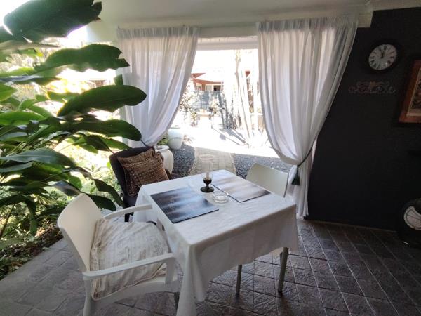 The living areas have been thoughtfully designed to embrace the South Coast lifestyle. Large doors and windows open the home to the outdoors, with two of the bedrooms leading directly onto private patios that overlook the sparkling swimming pool and entertainment area. This seamless indoor-outdoor flow makes the home perfect for hosting, entertaining, or simply enjoying quiet afternoons in the sunshine. The well-manicured garden adds another layer of beauty, with tropical palm trees, vibrant plants, and charming seating nooks spread throughout, creating little corners of privacy and tranquillity.