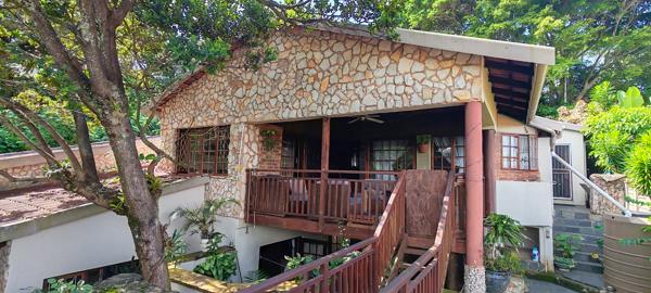 Spacious lounge with built-in braai, exposed stone walls, wooden ceiling beams, and a fireplace