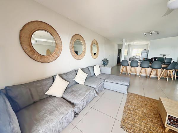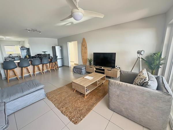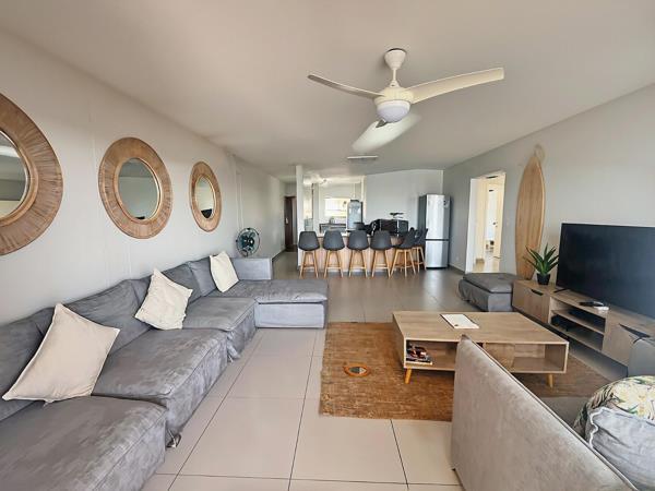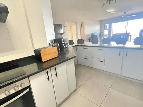 Step into a spacious open-plan living area featuring a lounge, dining space and a well-designed kitchen all flowing effortlessly onto a covered balcony with a built-in braai and spectacular breaker views of the Indian Ocean. The generous 160 m floor plan maximises light, space and comfort, creating a true sense of home.