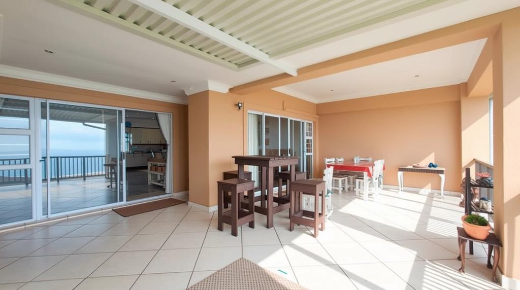 Step outside to an expansive covered patio and balcony, perfect for entertaining. This outdoor haven features a built-in braai, ideal for gatherings, and offers panoramic scenic and sea views. The property also boasts a refreshing swimming pool, paving, and a totally walled perimeter for privacy. Parking is well catered for with two garages and an additional parking space. Practical amenities include water tanks and an access gate, ensuring convenience and peace of mind in this coastal beach setting, perfect for aquatic activities.