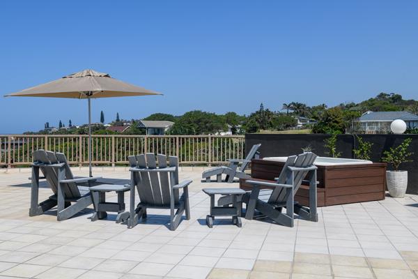 The cherry on the cake of this apartment, is the exclusive roof-top deck with its 180-degree sea view, equipped comfortably with outdoor lounging chairs & a Jacuzzi. There is a sparkling communal swimming pool & braai area for the use of all residents. One small dog OR two house cats are allowed with Trustees permission.