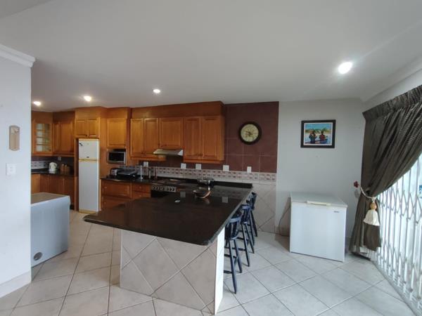 The culinary areas are well-appointed, with ample cabinetry, granite countertops and a laundry area, ensuring practical functionality. Sleeping accommodation comprises five generously proportioned bedrooms and four bathrooms, three of which are luxurious ensuites, providing privacy and comfort for residents and guests alike. The design prioritises relaxation and personal space, making this property suitable for larger families or those desiring ample room for visitors. Outdoor living is exceptionally catered for with an expansive patio, and balconies, all offering magnificent scenery and seaviews. The property features a built-in braai within a dedicated braai room, perfect for entertaining. Furthermore, residents benefit from access to a communal braai area, lapa and swimming pool, however the Main beach is a few hundred meters away for a casual dip.