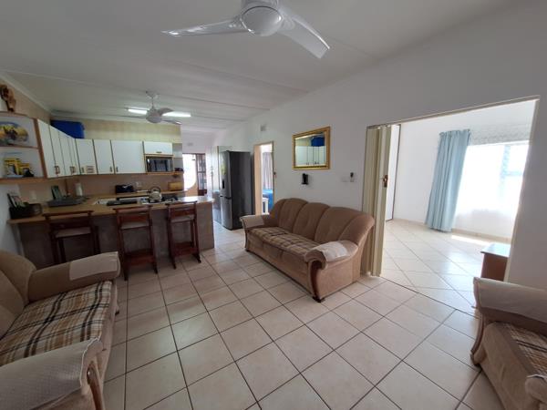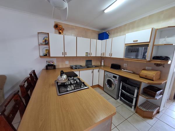 Inside, the 82 sqm floor plan features an open-plan lounge and kitchen area, designed for practical living. Tiled flooring throughout ensures easy maintenance, while ceiling fans provide comfort. The functional U-shaped kitchen is equipped with white cabinetry, wood-look countertops, a gas hob, and an eye-level microwave, alongside a convenient breakfast bar and space for a washing machine.