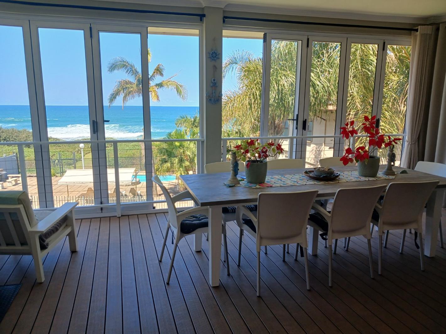 Superior quality accommodation with open plan area especially when you open the stacking glass doors and slip into the enclosed entertainment area where you can entertain and have a braai. Breathtaking 180-degree sea views from the lush of your apartment as well as from the down stairs area also with an enclosed patio. Upstairs: The kitchen is thoughtfully designed with granite tops, gas stove and ample cupboard spaces. The main bedroom (full en-suite) is fitted with blinds and air-conditioner, Downstairs: 1 Bedroom (en-suite) with air-conditioner and the other 2 share a separate bathroom and guest toilet. Both bedrooms leading to another entertainment area overlooking the ocean. Outside laundry with all the necessary connection points with court yard.