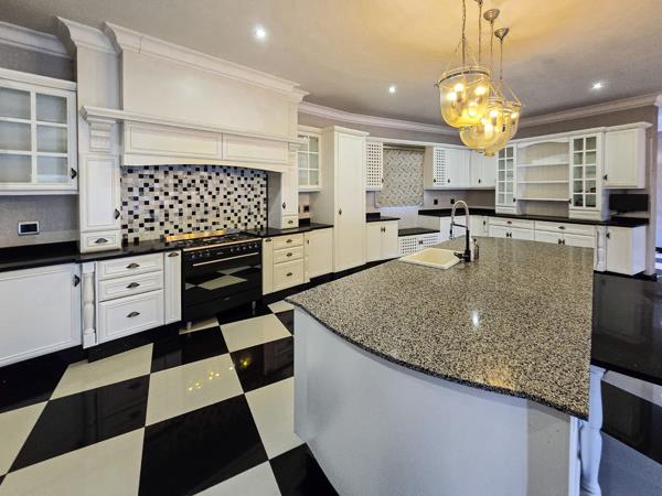 The kitchen, any women''s dream, features a scullery, laundry, and a well-appointed pantry. Equipped with a gas hob and electric oven, it also features a striking black granite-topped centre island and sleek white cabinetry.