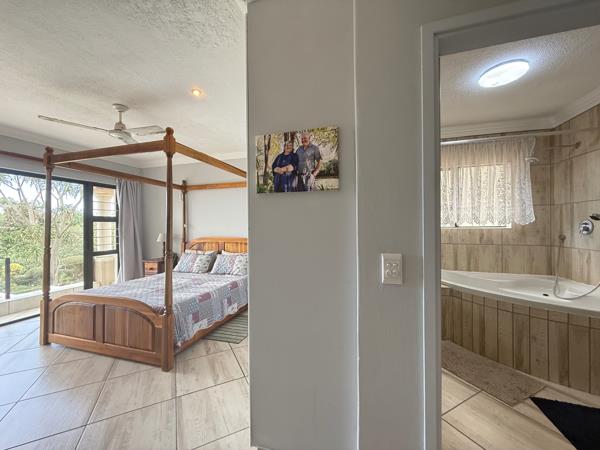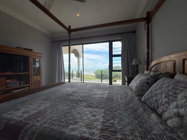 The open-plan living area flows seamlessly from the modern granite-topped kitchen (with scullery and laundry) through the dining and lounge area, all enjoying breathtaking ocean views. A custom-built bar (negotiable) adds a warm, social touch. The main bedroom also boasts sea views and an en-suite bathroom.