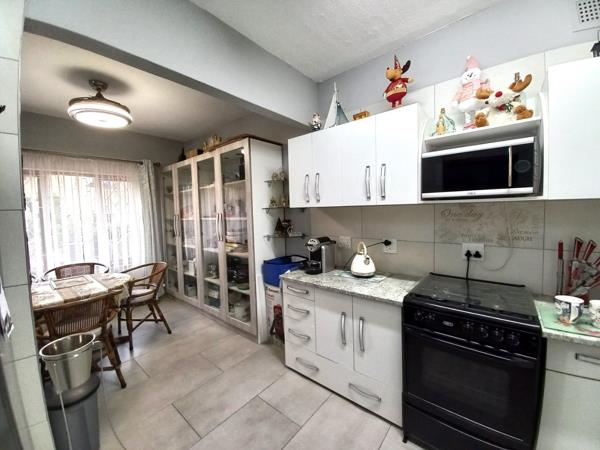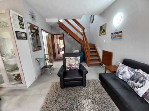 The lower level offers an open plan lounge, dining room and kitchen, with the lounge flowing onto a patio with a built-in braai. The kitchen has the most stunning cupboards and is the perfect space in which to prepare gourmet meals on the gas and electric stove. A powder room is also there for your convenience. This level also offers an enclosed courtyard with a private outdoor shower. The garage is tiled and is plumbed for your washing machine.