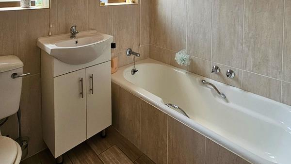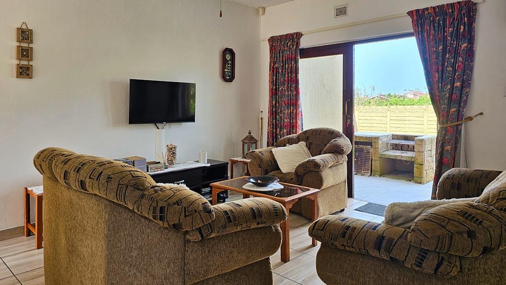 Welcoming and Beachy INDEED! The open plan lounge area opens to an undercover patio with a built in braai. The garden is private and the ocean drums relaxing in your ears. As you walk around the corner, the ocean lies in front of you in all is overwhelming beauty and glory. The garden gate then opens directly to the beach. There is no sea view from the ground floor, but one is aware of the ocean because of the smell and the sound. The lounge and ding area is spacious and light with a air-conditioning unit. There is also a guest bathroom with a toilet and a basin on this floor, so when you have guest they don''t intrude on your privacy upstairs. The kitchen is spacious with a breakfast counter, lots of cupboard space with a back door. This door allows the sea breeze to dance through your home as well as exiting to a paved court yard. From here you can enter the garage and the separate laundry. The laundry is equipped with both a washing and drying machine. The 3 bedrooms are on the first floor and they are all spacious and filled with natural light, ceiling fans and air-conditioning. 2 Of the 3 bedrooms open to a balcony from where you have some sea views. The 3 bedrooms are carpeted while the rest of the apartment is tiled. They all share a bathroom with a bath, shower and basin and a separate shower with a basin.