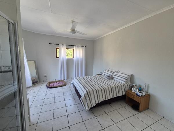 - 3 bedrooms with built-in cupboards, ceiling fans, and fully tiled floors