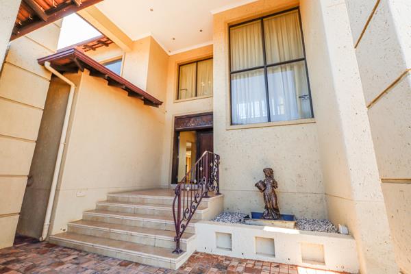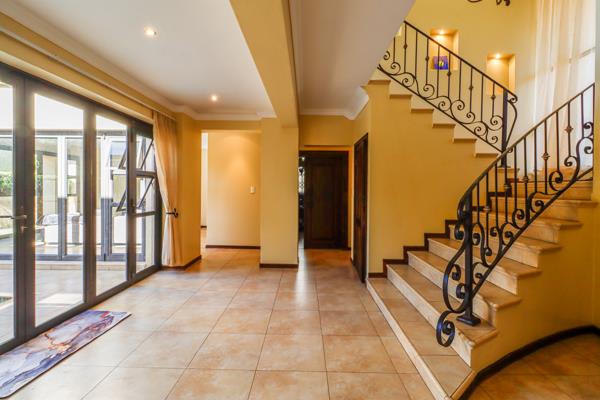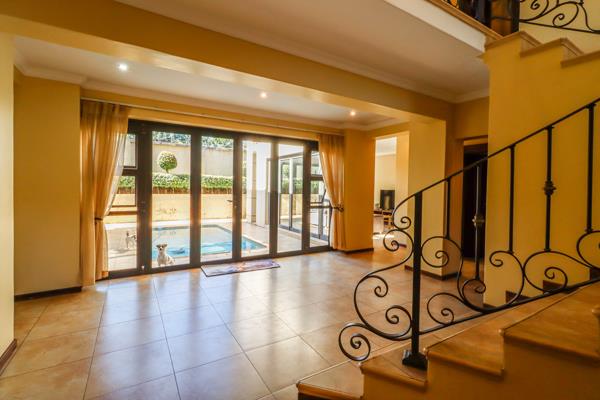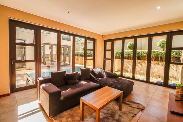 Elegant stacker glass doors open to a covered patio with a built-in braai, overlooking the pool and beautifully landscaped gardens.
