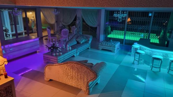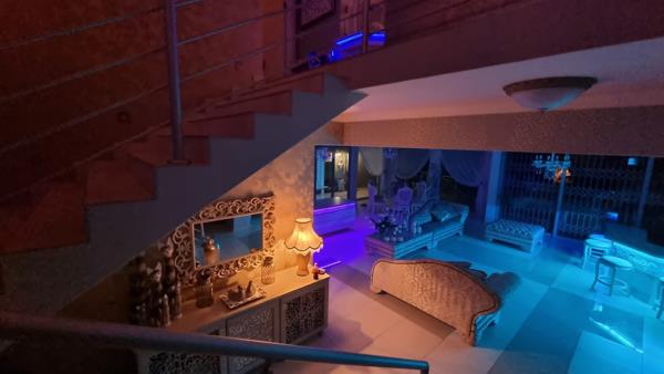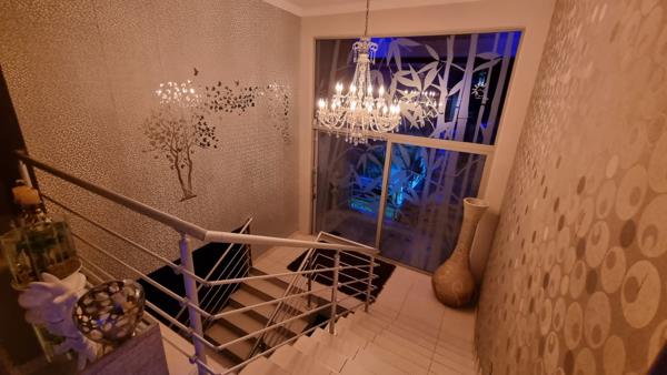 Inside, the open-plan layout flows effortlessly across three lounges and a formal dining area. Polished tiles, crystal chandeliers, and designer lighting create a sophisticated atmosphere. A feature staircase with sleek railings connects the levels, while a modern bar area adds a touch of style for relaxed entertaining. Every detail, from the air conditioning to the tasteful finishes, reflects careful attention to comfort and quality. The residence includes four spacious bedrooms one of which is currently used as a study and three beautifully appointed bathrooms. Each room offers privacy and luxury, ideal for family living or hosting guests.