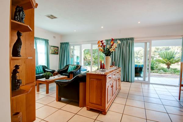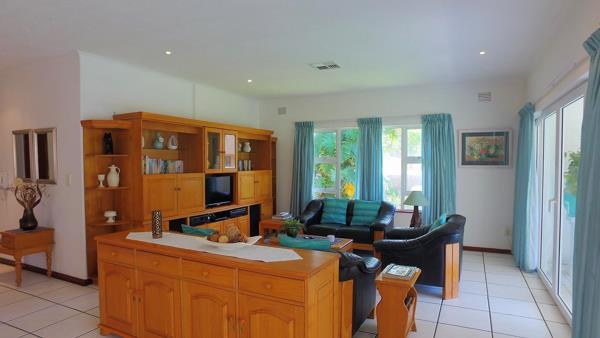 A spacious veranda overlooking the garden and ocean, featuring a Jet master built-in braai perfect for entertaining.