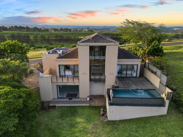 A grand entrance leads past a striking water-wall feature into a spacious, fully equipped gourmet kitchen with premium SMEG and AEG appliances, walk-in storage, and seamless flow to the open-plan dining and lounge areas. Expansive glass doors open to elevated decks, an infinity pool, and a private master suite deck designed for relaxed outdoor living. The upper gallery, complete with a home office and TV lounge, provides sweeping panoramic views across the forest canopy to the Indian Ocean.
