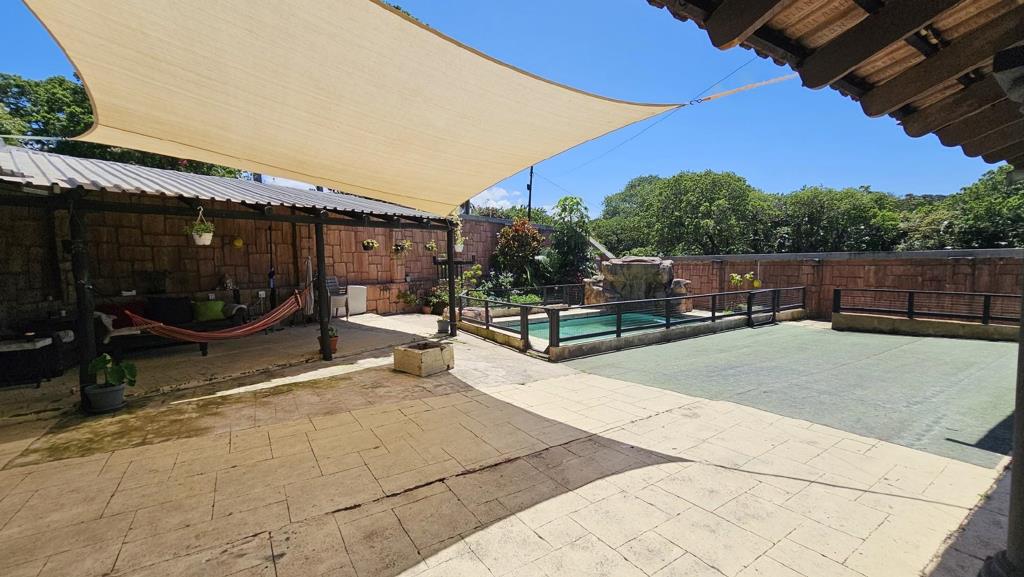 The open plan design of this home seamlessly connects the kitchen to a dining area, a comfortable lounge area and a childrens playroomsunroom creating beautiful flow. This beautiful space has three spacious bedrooms, 2 of which are fitted with ensuite bathrooms. Each bedroom has ample wardrobe space and two of the bedrooms have direct patio access. The home also has additional office space perfect for a home run business, although it could also double up as a flatlet with a few modifications. Step outside to discover a private oasis, the lush garden and crisp blue swimming pool with a rock waterfall creates a tranquil escape. A covered patio makes this area ideal for outdoor dining and entertaining. The property is also totally walled and all entrance points have trellidoors ensuring peace of mind. The home offers adequate parking as well as a double garage with roll up doors. The additional benefit of this property is that it offers staff quarters making it possible for staff to live in if need be. The home also offers a reserve water tank as well as a filtration system that filters the water before it goes into the tank or into the home.