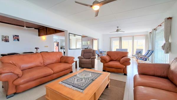The main house boasts an open-plan kitchen with granite countertops and a separate laundry, complemented by formal and informal dining areas, a formal lounge, and a casual living room. Sliding doors lead to an enclosed patio and a stunning pool area with a built-in braai, overlooking the ocean. The double-sized master bedroom offers space for a pajama lounge, while two additional bedrooms and a bathroom complete the main dwelling.