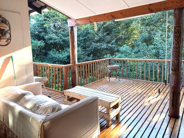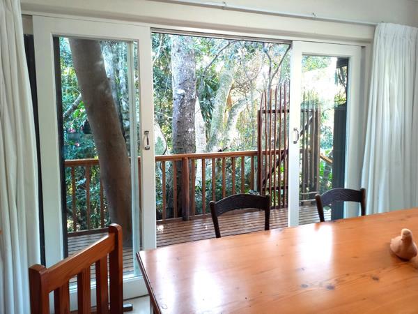 An immaculate home built with a specific dream of blending nature with daily living. A spacious open-plan tiled living area flows onto a deck looking into the tree tops. The kitchen is fabulous, fitted with granite tops, a gas hob an electric oven, and Beechwood cupboards. The dining room is slightly separated from the lounge and opens onto the deck.