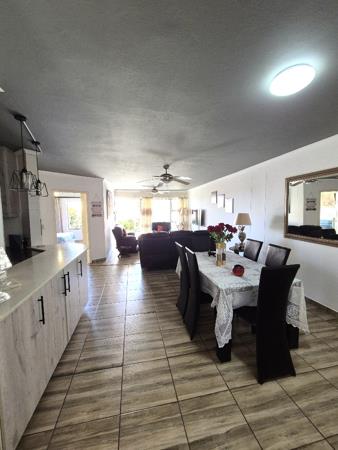 The spacious, open-plan lounge and dining area is fully tiled and includes ceiling fans, providing a cool and comfortable atmosphere. The modern kitchen boasts granite finishes, ample cupboard space, and is ideal for cooking and entertaining.