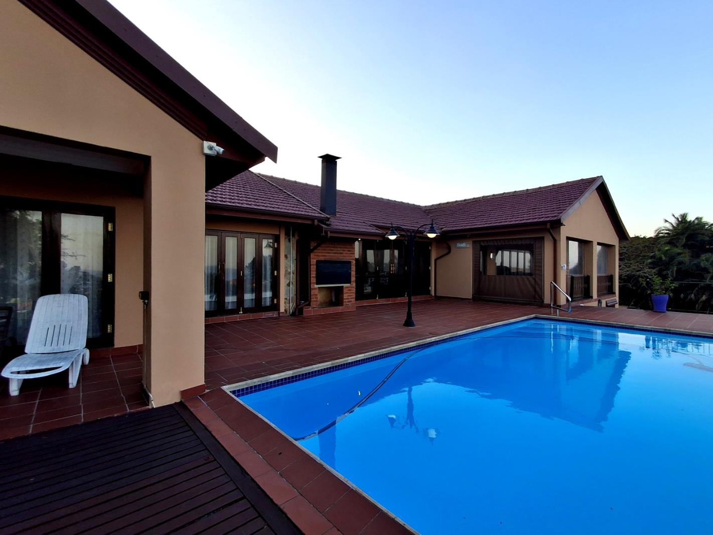Outdoor living is a highlight, centered around a large L-shaped swimming pool and a spacious terracotta-tiled patio, perfect for entertaining. An outdoor fireplace/braai area and a wooden deck provide additional spaces for relaxation, all set within a well-maintained garden. The property is pet-friendly and includes practical features like paving, an access gate, and water tanks.