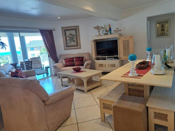 DUAL MANDATE: Open to reasonable offers! Step into this seaside apartment where the Indian Ocean welcomes you the moment you enter. The open-plan lounge, dining room, and neatly designed kitchen create a bright and inviting space, with sliding windows that frame breathtaking sea views. The kitchen is fully equipped with ample cupboard space, a washing machine, and a dishwasher, making it both practical and stylish. From the lounge, step onto the balcony to enjoy sunrises, whale watching, or simply relaxing in the sea breeze. The tiled patio, complete with a built-in braai, covered dining space, and deck chairs, makes for the perfect outdoor entertainment area.
