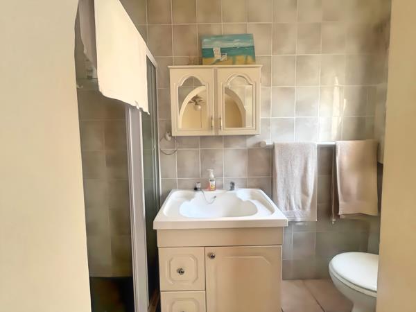 The home features three decent sized bedrooms, two of which include en-suite bathrooms. All bedrooms are fitted with built-in cupboards and ceiling fans. A third bathroom with a bathtub is available for guests or use by the third bedroom.