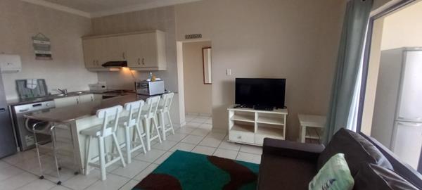 Open plan apartment that flows through sliding door to undercover balcony, overlooking the swimming pool/ braai area and distant sea views. Granite top kitchen with ample cupboards for a peaceful holiday or permanent living. The two bedrooms are spacious and both have an en-suite bathroom. The washer and dryer in the unit will ensure that you do not have to worry about taking dirty washing home. Jo Jo tanks available when necessary and a purified water tank for drinking water.