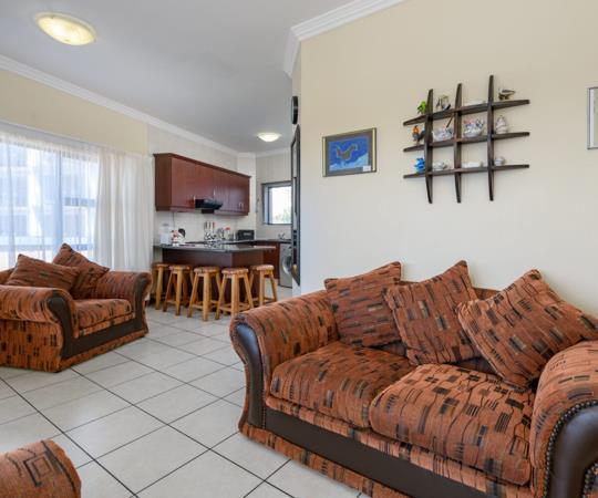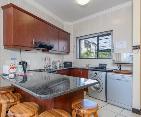 The kitchen has built-in cupboards, a breakfast nook, and granite countertops. You will find modern appliances such as stove, extractor fan, fridge, washing machine and tumble drier. The lounge has modern well maintained furniture. The lounge opens onto the balcony where you have good sea views. The unit also has a lock-up garage.