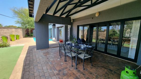 The impressive main dwelling boasts four bedrooms, three bathrooms, three double garages, a ladies gym, and a gents gym. Additionally, it features a spacious entertainment area with a guest bathroom and guest bedroom, which can either be retained as is or converted into a two-bedroom apartment. The meticulously kept tropical gardens add to the overall charm and move-in readiness of the property.