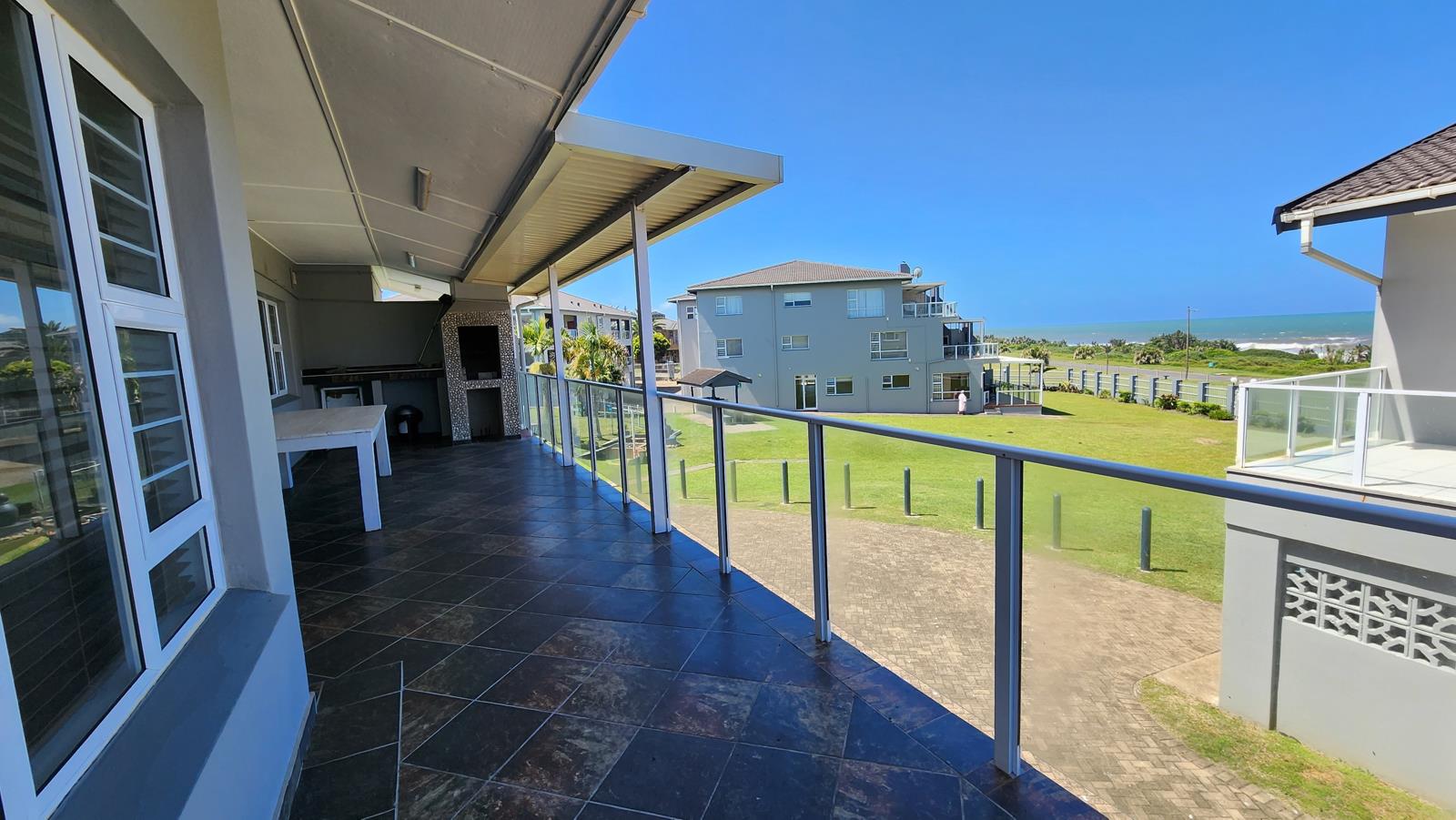 The apartment features an open-concept kitchen and living area that opens to a spacious balcony with a built-in braai with sea views.