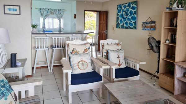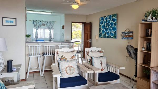 A GREAT INVESTMENT indeed!!! Suitable for a holiday home or a permanent residence, the location is optimal. Great investment for holiday rentals as well. As you step inside, the vibe of the ocean is immediate and lovely. As you enter the open plan kitchen/lounge dining room area , the kitchen is open plan and well equipped with a breakfast nook.The open-plan lounge a The lounge has a sliding door leading out onto a small patio where you can enjoy your morning coffee or an evening cocktail.The main bedroom is en-suit and has a large window from where you can enjoy sea views as you wake up in the morning. The second bedroom is spacious and has 2 single beds in. The second bathroom is available for the 2nd bedroom and guests. This apartment is being sold fully furnished, making it an seamless sale.