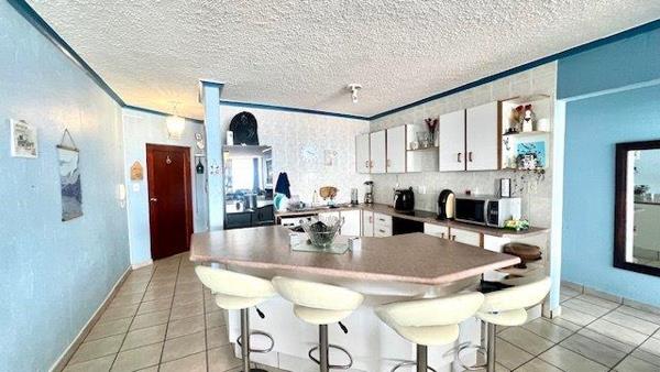The heart of the home is its open-plan kitchen, complete with a cozy breakfast nook, seamlessly flowing into the spacious living area. This inviting space opens onto a large covered balcony, where breathtaking sea views create the perfect backdrop for relaxing or entertaining. The built-in braai area on the balcony is ideal for enjoying quality family time while savouring the ocean breeze.