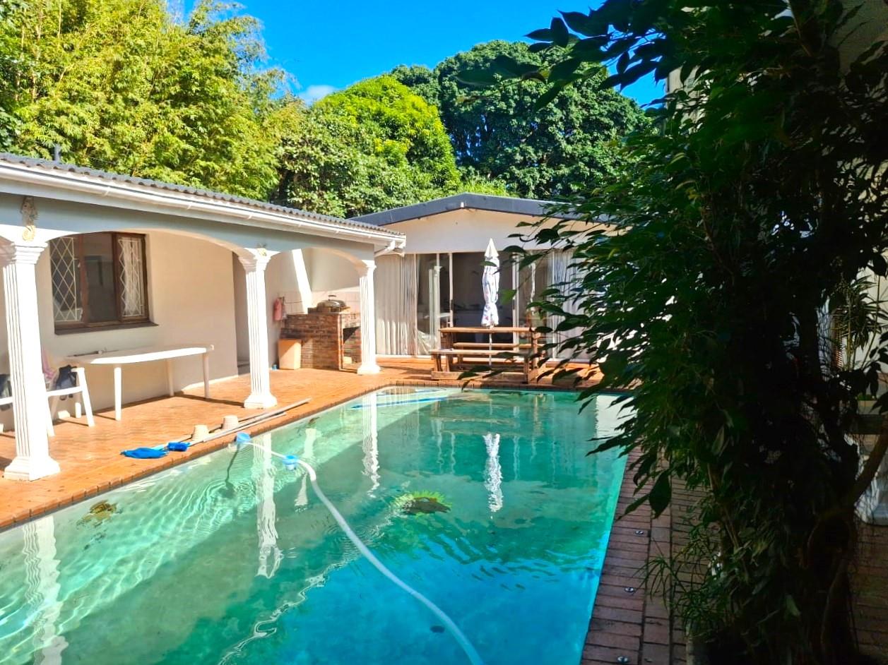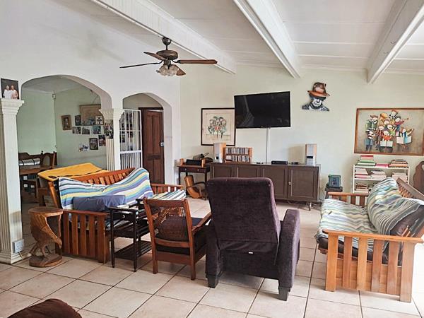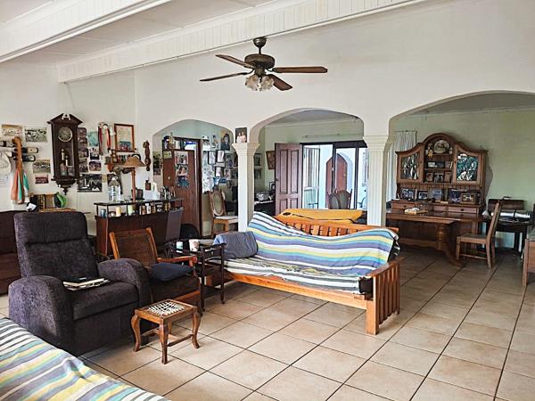 This very large home is located in ever popular Uvongo not far from the village center, waterfall and beach and a must view property for anyone looking to live and generate income on the stunning South Coast. This character filled, secure home is nestled in a beautiful garden with and abundance of fruit trees, including a lime tree, 4 different Avo trees and a pawpaw tree, providing a very peaceful atmoshere to relax in. The main home comprises of a large open plan lounge dining area leading to the spacious kitchen on one side and onto a private patio overlooking the garden at the front. The sleeping area comprises of 2 bedrooms, both with en-suite bathrooms serving the main house and 4 more bedrooms, a further bathroom, kitchenette and a very spacious room which was the entertainment area for guests, all surroung the lovely pool area. In addition to this there is more accomodation which will need some upgrading before it could be utilised which are staff rooms with facilities and a storage room. The property is secured by 24 hour response and internal beams. Call Gary to view this great opportunity at the coast.