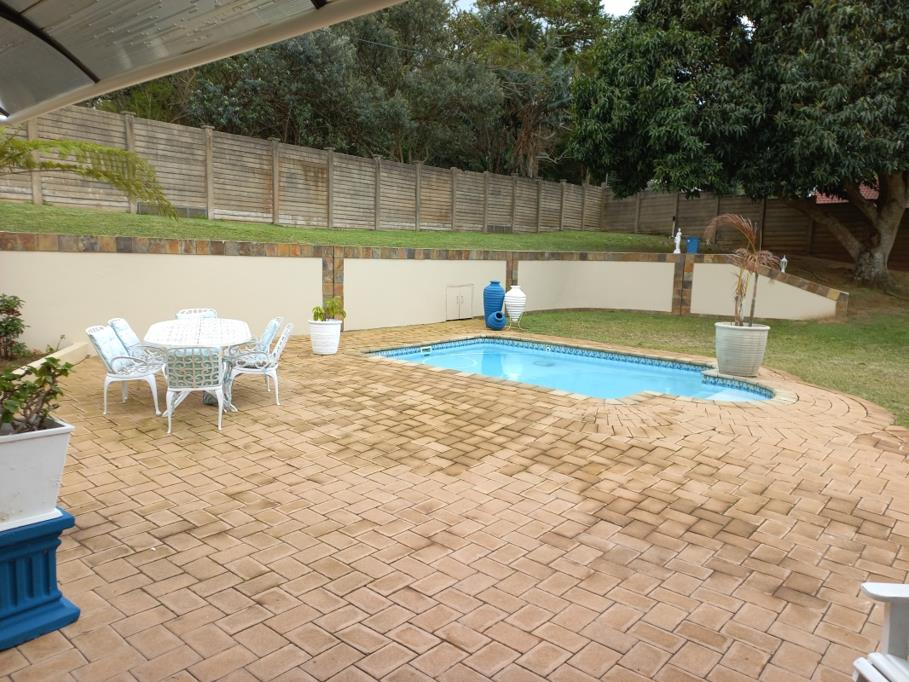 Enter into the open plan living and dining area flowing seamlessly into a modern kitchen, complete with granite tops and a gas stove. Soak up the natural light from the t large windows which create such a welcoming ambiance, and then into an enclosed sunroom with exquisite ocean views. At the rear of the home, a 2nd enclosed entertainment area with its built-in braai opens through sliding doors onto a private pool, jacuzzi, in a spacious well maintained yard.