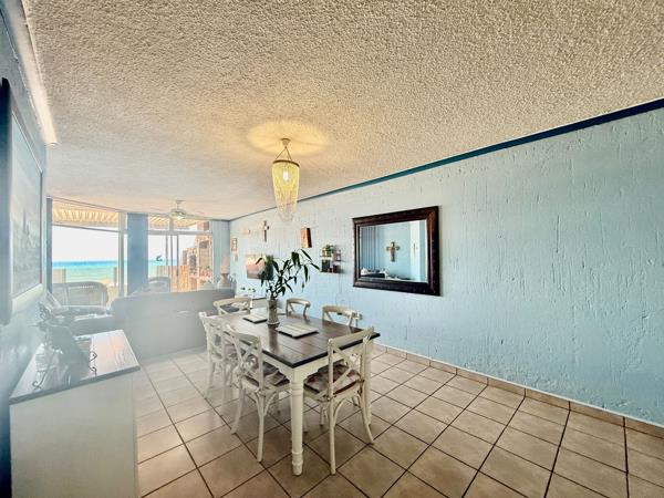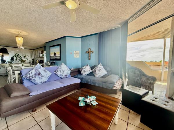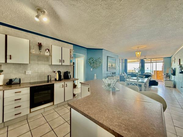 The open-plan kitchen includes a cosy breakfast nook and flows seamlessly into the dining and lounge areas, which open onto a sea-facing balcony where you can relax and take in the panoramic views. The pet-friendly complex offers excellent security with 24-hour surveillance, electric fencing, and a fully walled perimeter. Residents also enjoy a sparkling communal swimming pool and a lock-up garage for added convenience.