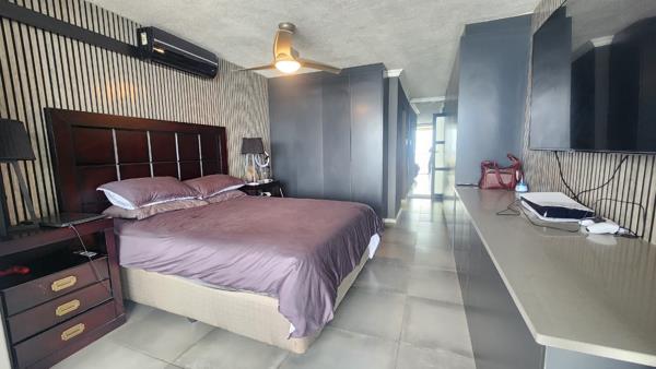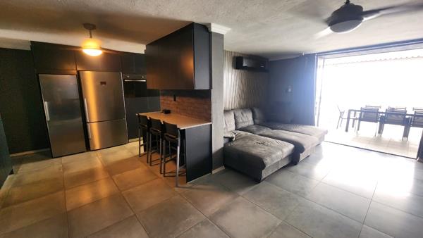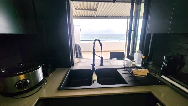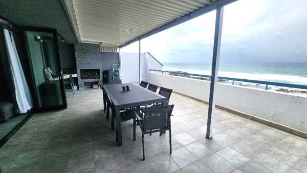 The spacious open-plan living and dining area flows seamlessly onto a generous undercover balcony, complete with a built-in braaiperfect for entertaining while soaking in the ocean vistas. Cleverly designed one-touch cupboards provide ample storage along the living space walls, blending functionality with style.