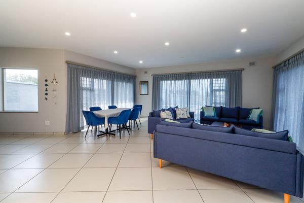 Open-Plan Living: A spacious lounge and dining area seamlessly connects to the patio through glass sliding doors, creating an effortless flow between indoor and outdoor living.