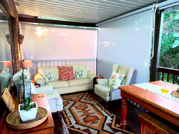 This spacious 3-bedroom unit, with master en-suite is free standing and very private at the end of a cul-de-sac. The view from the large deck is onto trees and coastal bush with prolific bird life. This exceptional unit has top-notch fixtures and fittings with Caesarstone counter tops in the open plan kitchen and dining area. Cupboards are plentiful and generous with high quality sliding drawers and soft close doors. Two newly installed air conditioners provide relief during the hot summer months a 12 000 BTU in the main bedroom and a 24 000 BTU in the open plan lounge/dining area/kitchen. A large double garage with automated door is accessed directly from the open plan kitchen and is wired with a generator switch-over control box to provide backup during load-shedding (generator not included in the sale).The beautiful open plan living space leads onto the deck which is a very comfortable additional living area, fully enclosed by a wooden railing and high-quality roll down blinds a special, contemplative space to start your day while sipping your first cup of coffee.