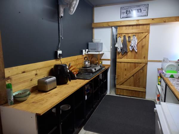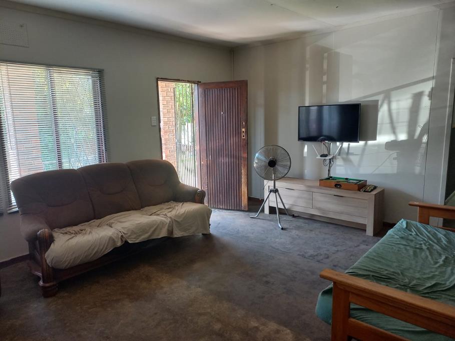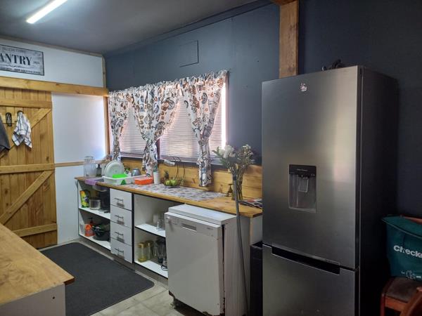 Main house: Lounge opening onto a patio, open-plan kitchen with pantry and dining area, three bedrooms all with built in cupboards (main with walk-in cupboard), and a bathroom with shower, basin, and separate toilet