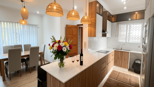 The modern, fully-fitted kitchen flows seamlessly into the lounge and dining areas, making it ideal for both daily living and entertaining.