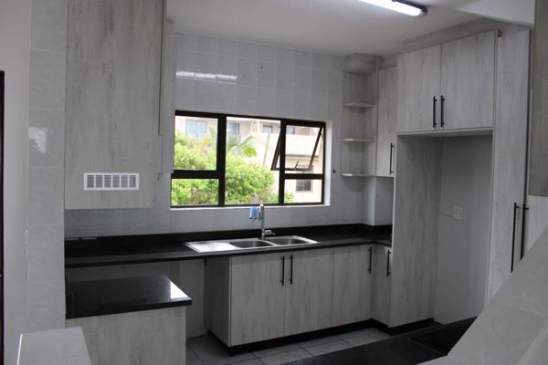 Upon entering, you’re welcomed into a sleek new kitchen featuring granite countertops, an under-counter oven, and a glass hob. Designed for convenience, the kitchen also includes under-counter space for both a washing machine and dishwasher, plus ample room for a large side-by-side fridge. The kitchen flows seamlessly into the open-plan lounge and dining area, which leads out through aluminium sliding doors onto a spacious balcony boasting panoramic sea views along with lovely outlooks over the landscaped gardens and inviting pool area.