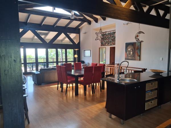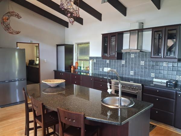 Step inside to an inviting open-concept living space, characterized by high vaulted ceilings with exposed architectural beams that enhance the sense of spaciousness. Large glass doors flood the interior with natural light and offer direct access to the scenic outdoors. The home includes a comfortable lounge and two well-appointed kitchens, one featuring a large central island, dark wood cabinetry, granite countertops, and modern stainless steel appliances, perfect for culinary enthusiasts.