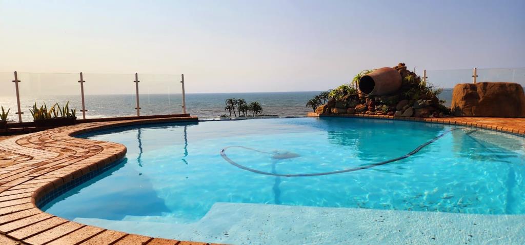 The main living area invites you to enjoy all that the well-equipped kitchen, dining room, family room and built-in bar can offer. Glass sliding doors leads you outside to enjoy the open space of a large patio, braai and infinity pool with the stunning sea views as a backdrop.