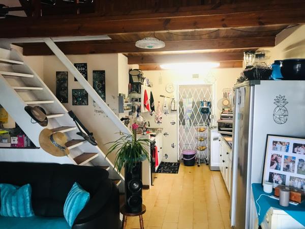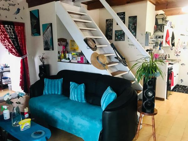 The home features an open-plan kitchen and living area, fully tiled throughout for easy maintenance. Two bedrooms come with built-in cupboards, while the third bedroom is a charming loft room, ideal for guests or a study.