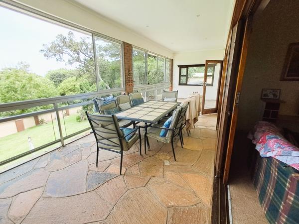 Perfectly suited for a large family, this property features a large, neat kitchen with a separate scullery, seamlessly connecting to the dining room and lounge. The cozy lounge includes a fireplace and opens to a sunroom that overlooks the sparkling pool and lush garden, all framed by a stunning distant ocean view.