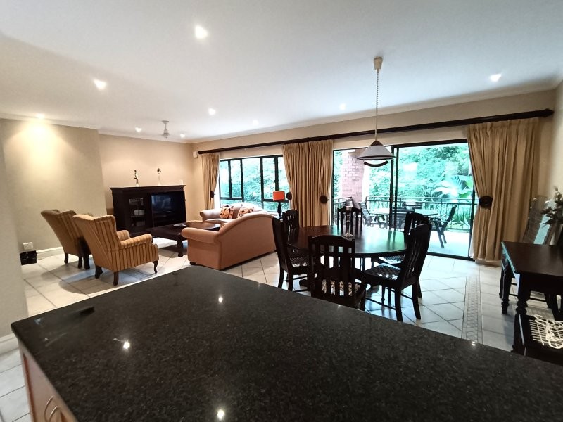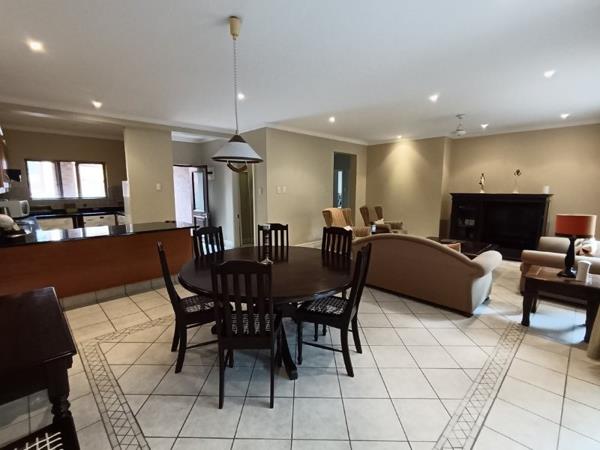 Modern Living Spaces: Open-concept kitchen and lounge design with seamless flow to the dining area, opening onto a covered patio with a built-in braai, perfect for entertaining amidst lush surroundings.