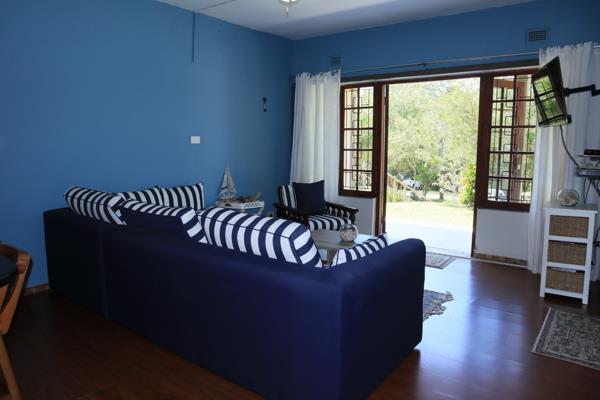 The interior boasts an inviting open-plan lounge and kitchen area, characterized by a vibrant blue accent wall and cohesive nautical/coastal decor. The lounge features a spacious L-shaped sectional sofa and warm hardwood flooring, benefiting from ample natural light. The functional kitchen, though with some dated finishes, includes wood-toned cabinets and tiled walls, perfect for everyday living.